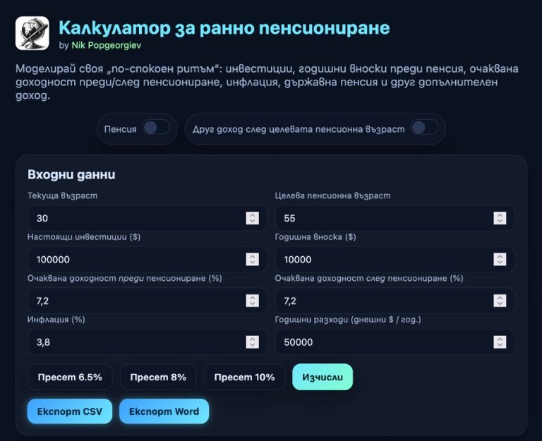 След близо 20 години на борсите открих, че истинската цел на инвестирането не е доходността, а спокойствието. Този калкулатор за ранно пенсиониране ще ви помогне да разберете кога и как може да си позволите да забавите темпото — без тревога, без паника, и с усещане за контрол върху бъдещето.